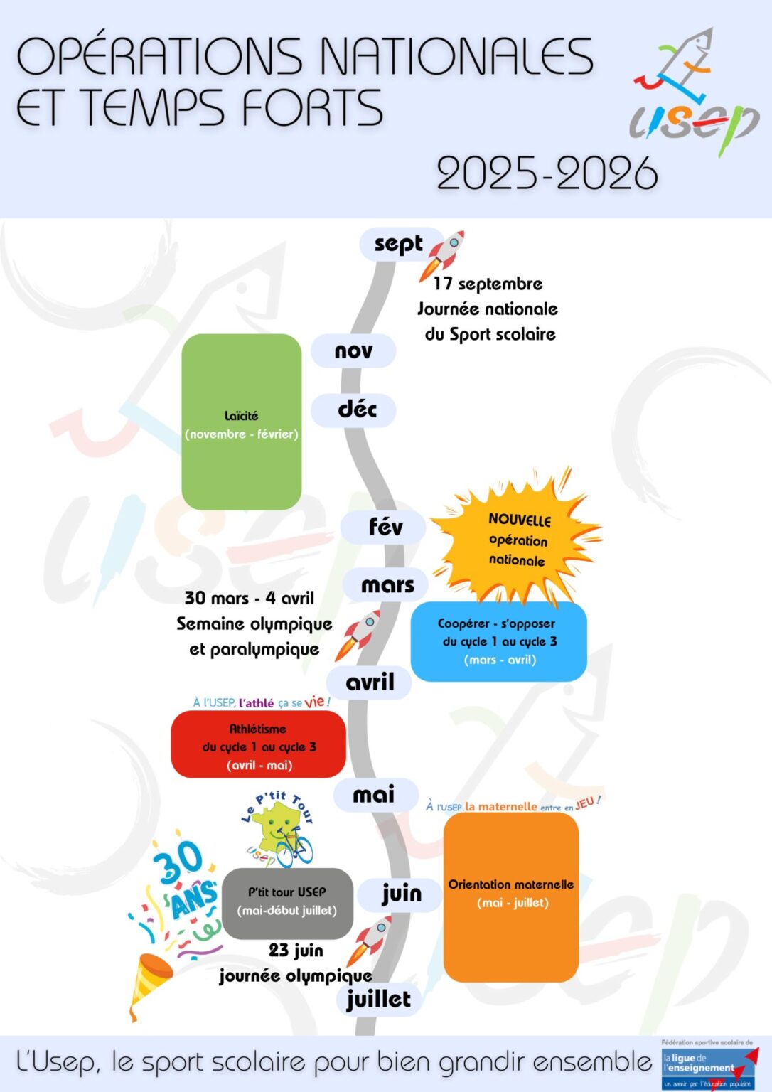 Propres à l’USEP ou développées conjointement avec d’autres fédérations, les opérations nationales rythment l’année scolaire.