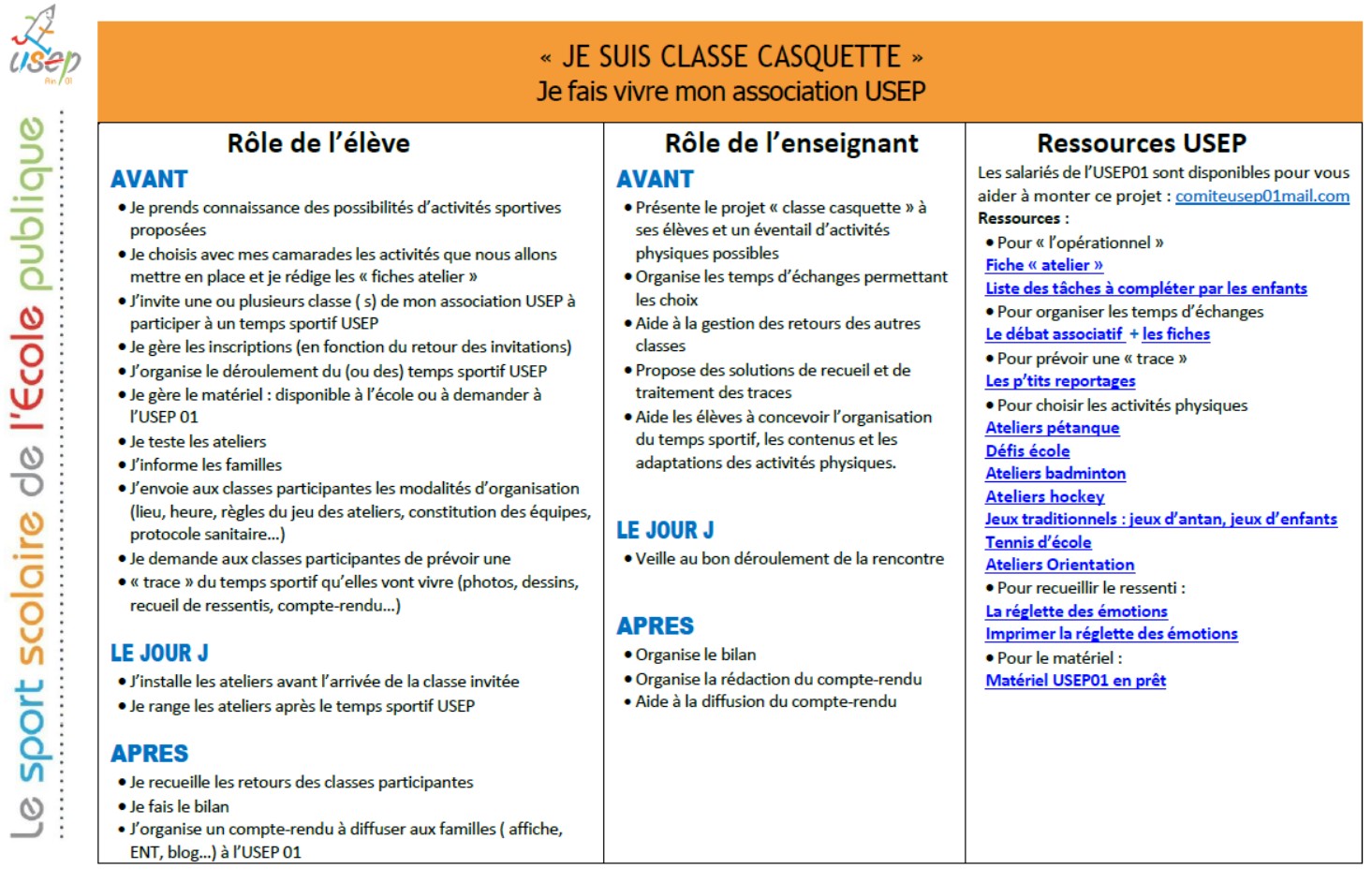 Principe : la classe casquette conçoit et organise une rencontre sportive pour d’autres classes. Les casquettes permettent d’identifier les enfants organisateurs pendant la rencontre.